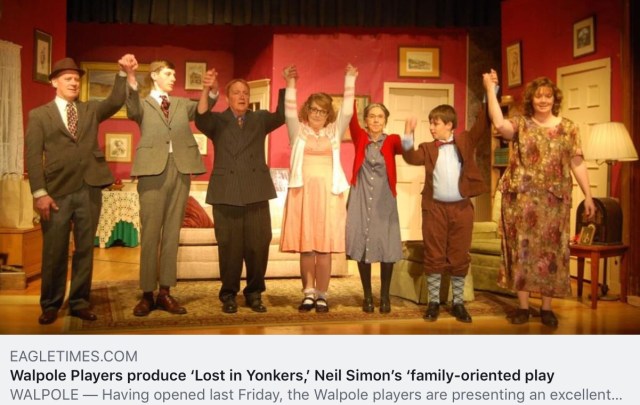 The reviews are in! Get your tickets now for Lost in Yonkers. Remaining shows are Saturday at 7:00 and Sunday at 2:00, at the Helen Miller theater at the Walpole Town Hall. Tickets will be available at the door. Email walpoleplayers@gmail.com for more info.