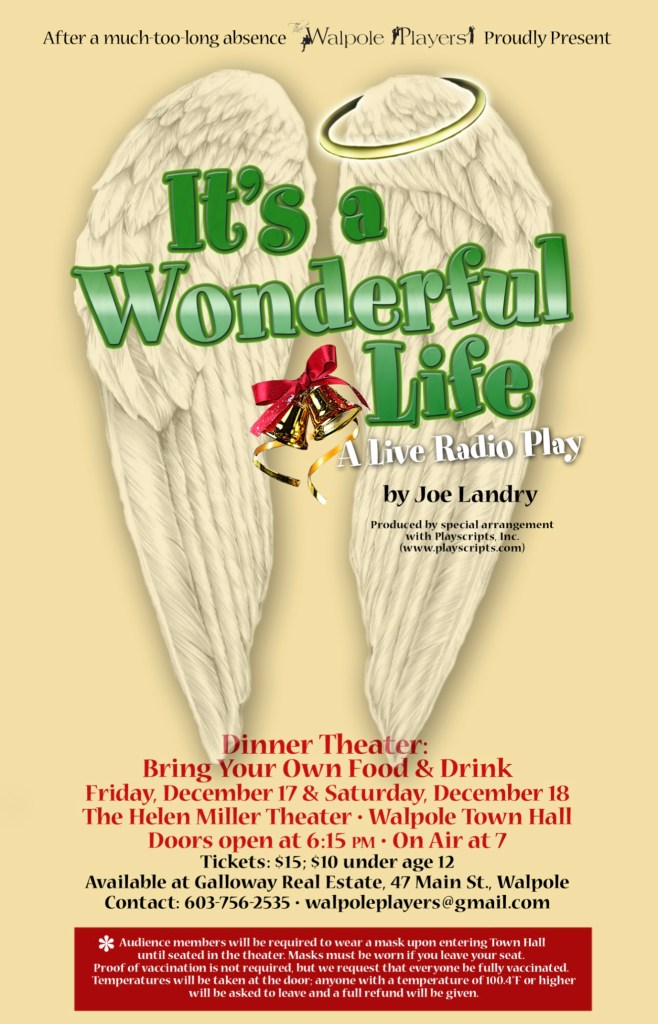 The Walpole Players are excited to be returning to the Helen Miller Theater in the Walpole Town Hall with a live holiday performance of It’s a Wonderful Life: A Live Radio Play by Joe Landry. This well-loved holiday classic comes to life as a live 1940s radio broadcast, with a small ensemble of actors playing dozens of characters as the story of idealistic George Bailey unfolds until one fateful Christmas Eve.
